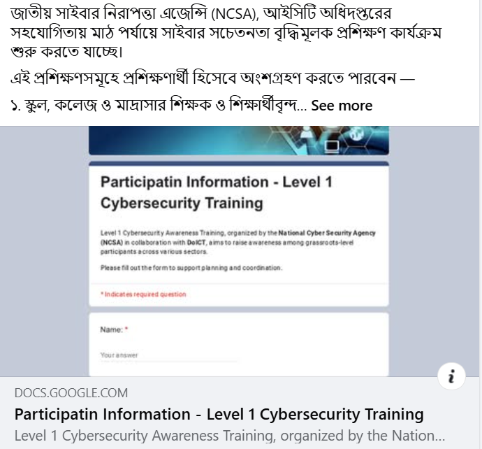 | ২ | সাইবার সচেতনতা বৃদ্ধিমূলক প্রশিক্ষণে অংশগ্রহণের জন্য গুগল ফর্ম পূরণ প্রসঙ্গে। | | ০৭-০৯-২০২৫ | দেখুন |